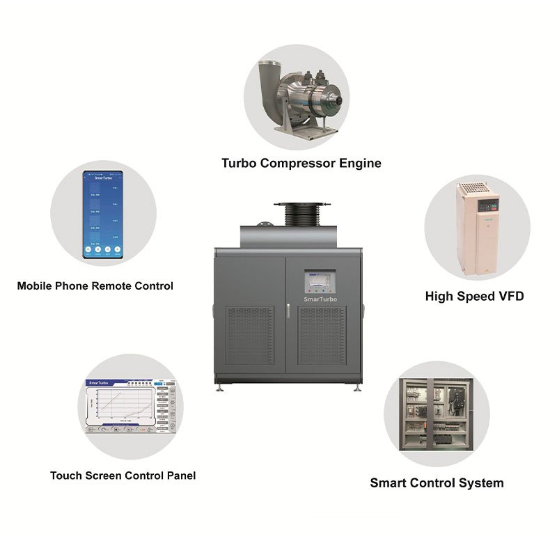 Турбокомпрессор включает в себя компрессор, высокоскоростной преобразователь частоты, систему управления, сенсорный экран и пульт дистанционного управления.