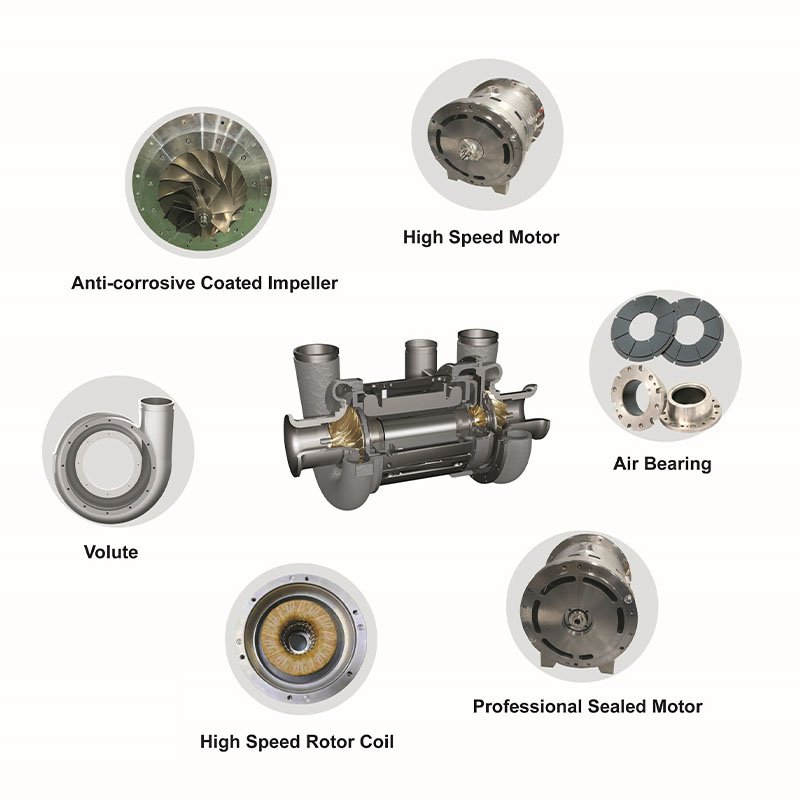 Компрессор состоит из основных компонентов, таких как импеллер с антикоррозионным покрытием, высокоскоростной двигатель, воздушный подшипник, герметичный двигатель, катушка ротора и yлитка.