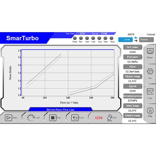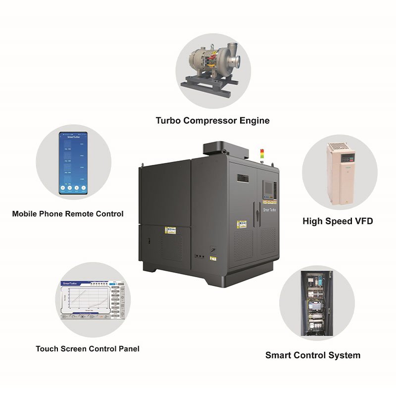 Турбокомпрессор включает в себя компрессор, высокоскоростной преобразователь частоты, систему управления, сенсорный экран и пульт дистанционного управления.