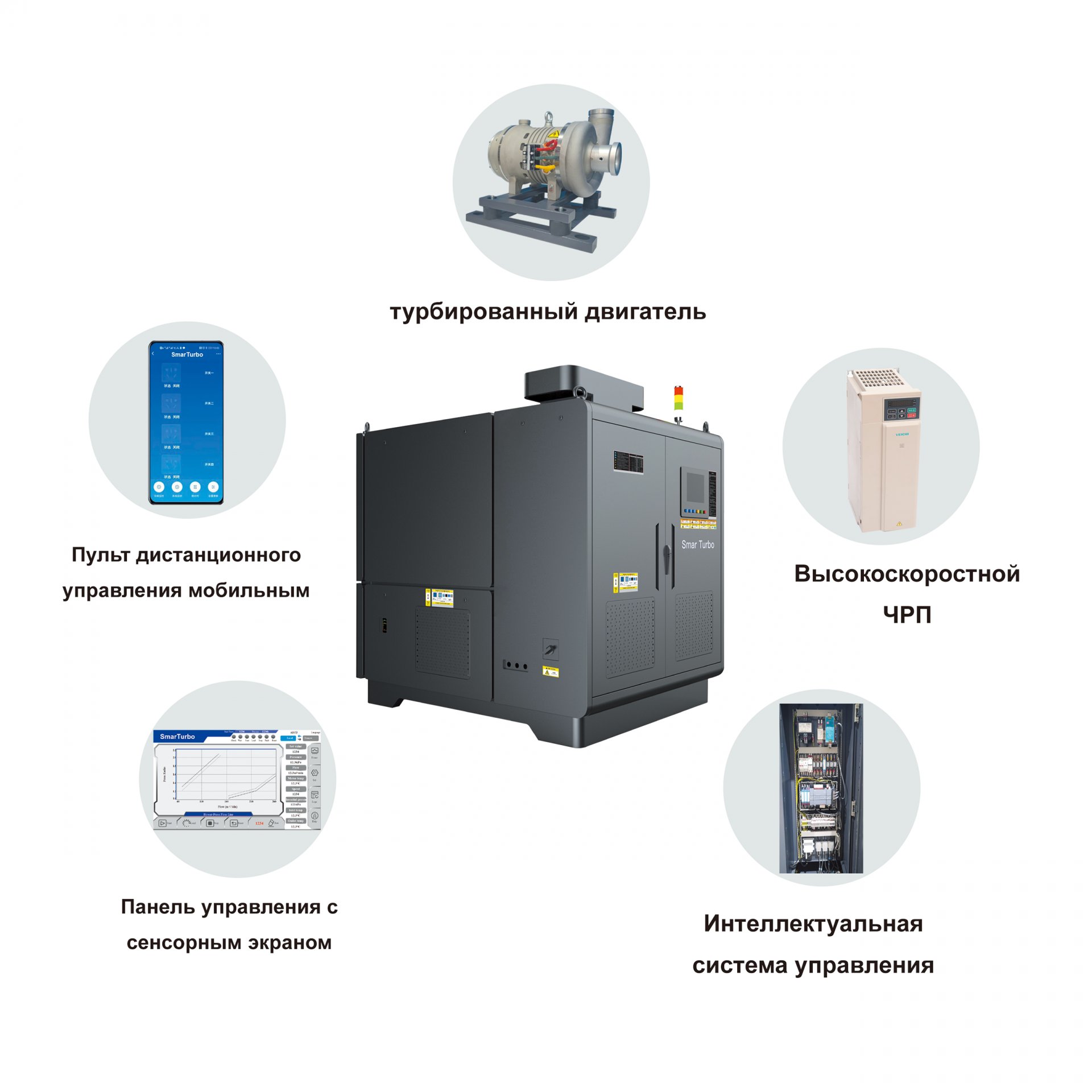 Турбокомпрессор включает в себя компрессор, высокоскоростной преобразователь частоты, систему управления, сенсорный экран и пульт дистанционного управления.