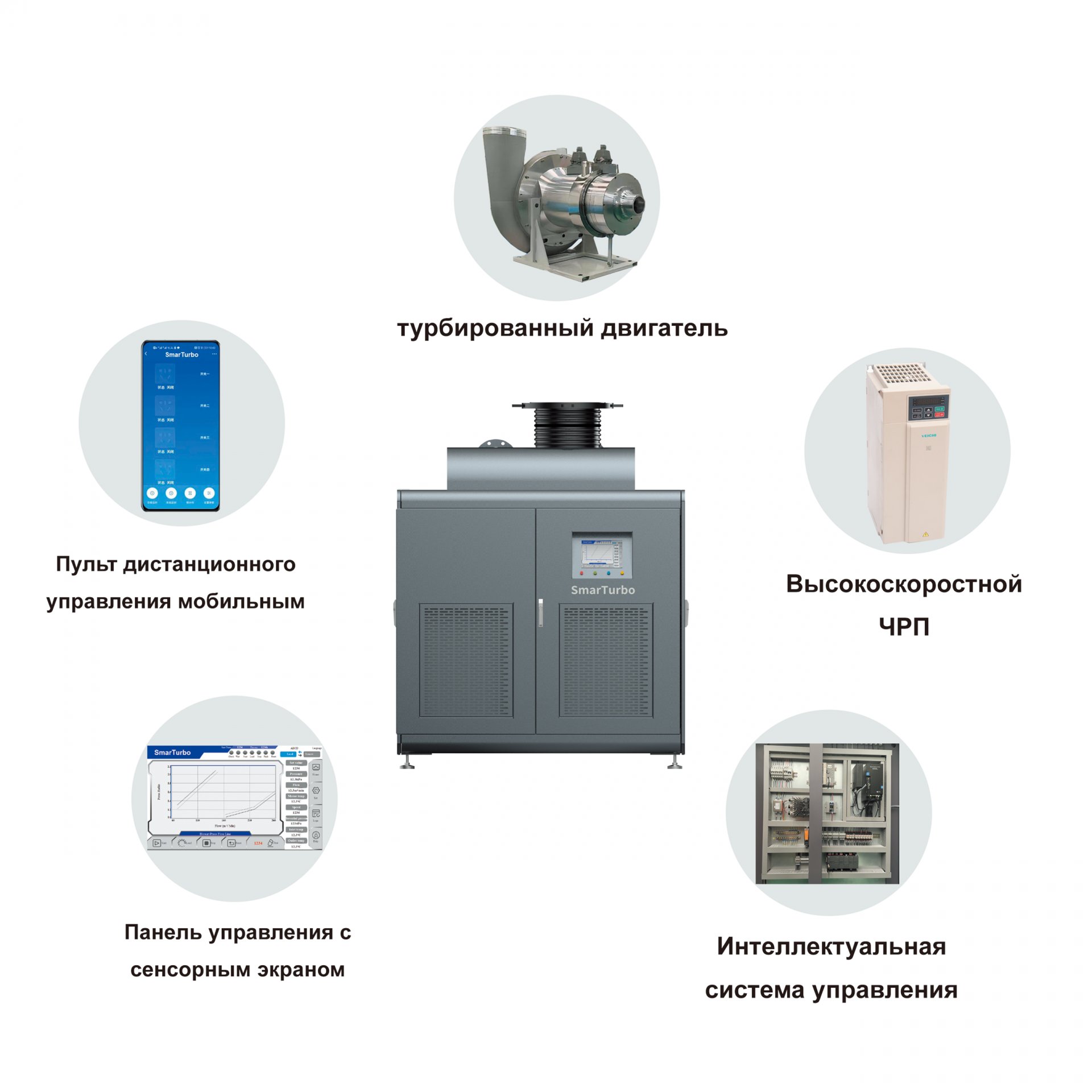 Турбокомпрессор включает в себя компрессор, высокоскоростной преобразователь частоты, систему управления, сенсорный экран и пульт дистанционного управления.